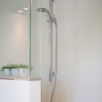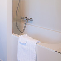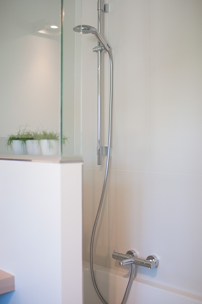 • Aparte badkamer met ligbad / douche, wastafel, ingemaakte leg- en hangkast, toilet